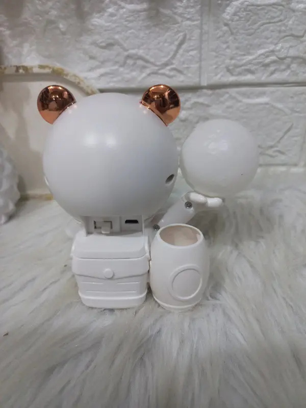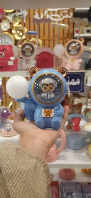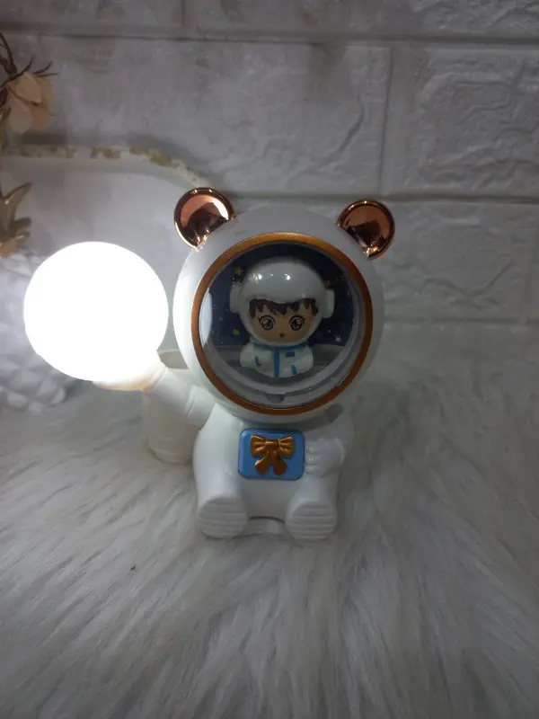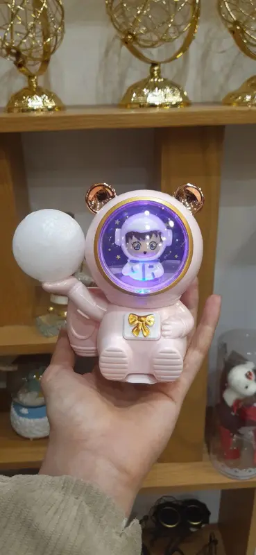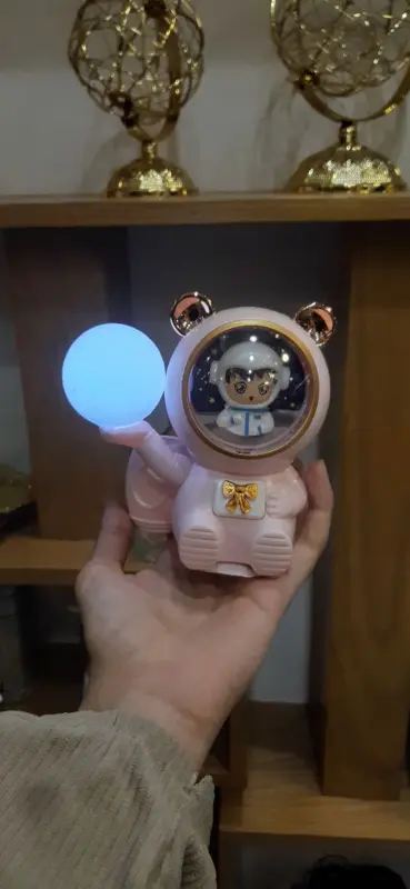 هذه الأباجورة الفريدة تجمع بين الخيال العلمي والتصميم الجذاب، وهي مثالية لعشاق الفضاء والمهتمين بالاستكشاف. مصممة على شكل دب رائد فضاء بملامح لطيفة وخوذة شفافة، تحمل بداخله شخصية كرتونية صغيرة تطفو بين النجوم. يحمل رائد الفضاء في يده مصباحًا كرويًا يشبه الكوكب، مما يمنح إضاءة ساحرة وهادئة.