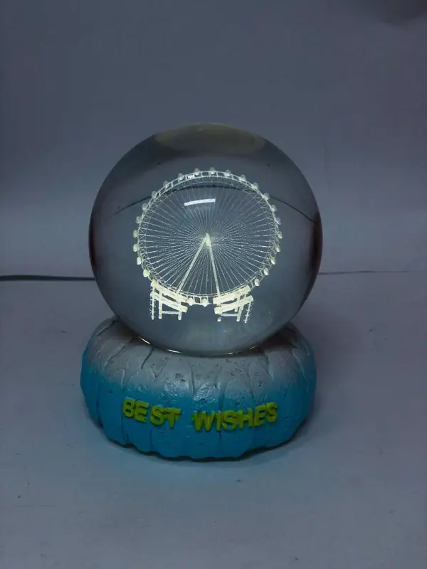 انقل سحر الأمسيات المضيئة إلى مساحتك مع بلورة الأمسيات الساحرة. هذه القطعة الفنية الصغيرة تجسد عالماً من الخيال داخل كرة زجاجية شفافة، حيث تظهر ساقية (عجلة دوارة) مضاءة بلمسة من النوستالجيا والجمال.