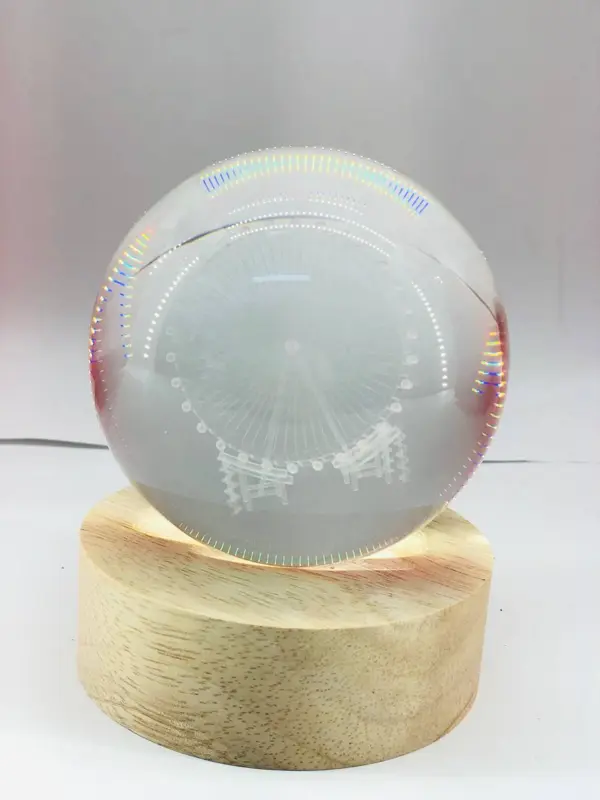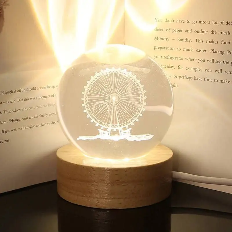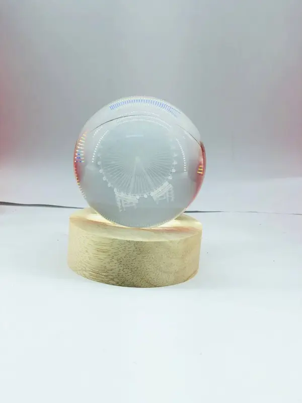 تستقر هذه البلورة على قاعدة خشبية أنيقة تزيد من جمالها وتفردها، وتعمل بالبطاريات لتمنحكم الحرية في وضعها في أي مكان، لتضيء غرفتكم بلمسة حالمة. إنها ليست مجرد قطعة ديكور، بل هي نافذة على عالم من السحر، تضيء زاوية من منزلكم، وتضيء قلوبكم بالذكريات.