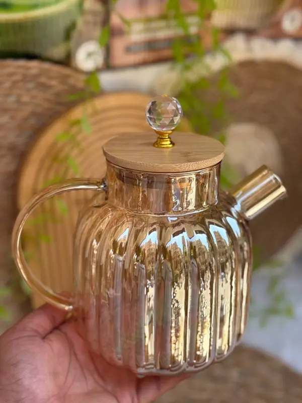 أناقة فائقة وتصميم لا مثيل له. نقدم لكِ براد الشاي الأنيق، وهو قطعة فاخرة وعملية، تم تصميمها بعناية لترتقي بتجربة تحضير وتقديم الشاي والأعشاب. يتميز البراد بتصميمه المضلع ولونه العسلي الدافئ، المصنوع من زجاج البايركس الحراري الصحي، مما يضمن متانته وقدرته على تحمل درجات الحرارة. يأتي البراد مزودًا بغطاء خشبي أنيق مع مقبض كريستالي، ومصفاة داخلية عملية لتصفية الأعشاب بكل سهولة. يمكن استخدامه لتحضير الشاي والأعشاب ووضعه على شياطة، مع تجنب وضعه على النار مباشرة. البراد متوفر بسعتين مختلفتين، 1 لتر و1.5 لتر. إنه الخيار الأمثل للمسة من الجمال والأصالة في ركن الشاي الخاص بك.
