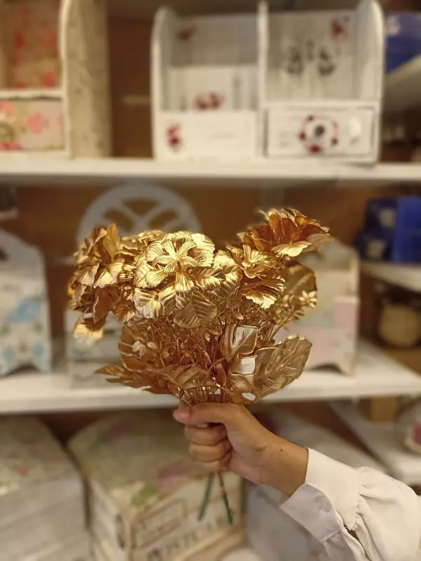 يتكون البوكيه من ورود ذهبية مصنوعة من خامة متينة بطلاء ذهبي لامع، مع إضافة لمسات من الورود البيضاء الصغيرة التي تزيد من جماله. تم تنسيق البوكيه بعناية فائقة وتغليفه في ورق لامع شفاف مع شريط أنيق، مما يمنحه مظهرًا راقيًا وجاهزًا للإهداء.