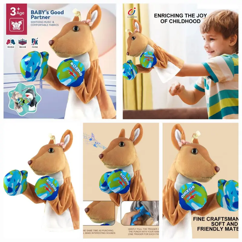 الدمية مصنوعة من خامة ناعمة ومريحة وآمنة للعب. تتميز بتصميم جذاب على شكل كانجارو يرتدي قفازات ملاكمة ملونة. يمكن للأطفال ارتداء الدمية على أيديهم والتحكم في حركتها. عند اللكم، تصدر الدمية أصواتًا موسيقية ومؤثرات صوتية ممتعة، مما يزيد من الحماس والمتعة.