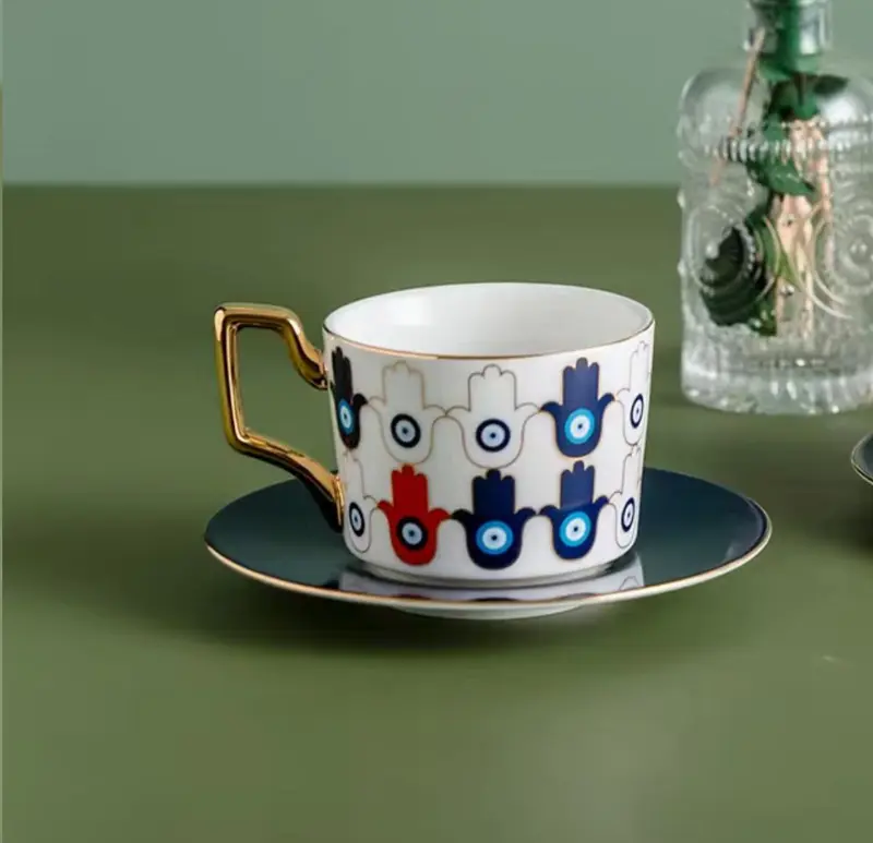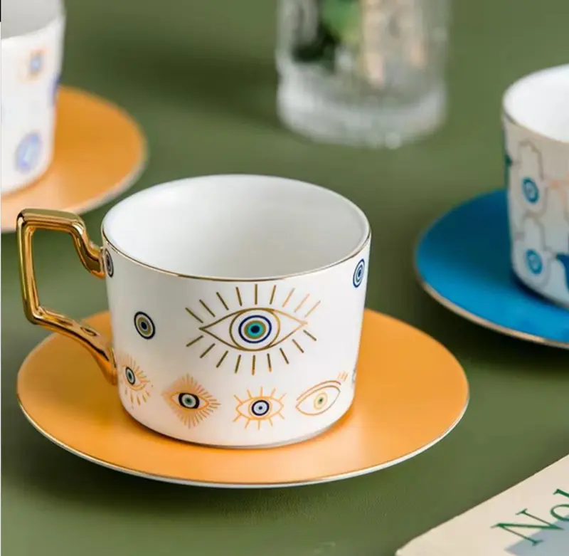 أضيفي لمسة من الغموض والأناقة إلى لحظات قهوتك أو شايك مع هذا الطقم المميز من الفناجين. تتميز الأكواب بتصميمات فريدة ومزخرفة بأشكال العيون، مما يجعلها قطعة فنية مميزة على مائدتك. تأتي الأكواب مع أطباق متناسقة، مما يجعلها مثالية لتقديم المشروبات الساخنة بأسلوب عصري وجذاب.