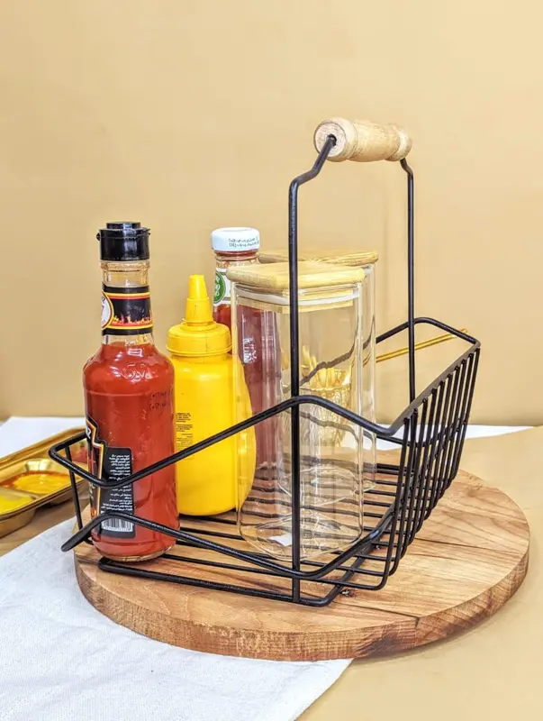 أناقة عصرية وتنظيم لا مثيل له. نقدم لكِ حامل الصوصات الأنيق، وهو قطعة عملية وفاخرة، تم تصميمها بعناية لتكون إضافة مميزة لمائدتك أو مطبخك. يتميز الحامل بتصميمه المعدني الأسود العصري، والمزود بيد خشبية أنيقة تضفي لمسة من الدفء والجمال، كما أنه مصنوع من المعدن عالي الجودة لضمان متانته وقدرته على تحمل الاستخدام اليومي. يُعتبر هذا الحامل الحل الأمثل لترتيب الصوصات والتوابل، حيث يضفي لمسة من النظام والأناقة. بفضل تصميمه العملي، يمكن حمله بسهولة ليصبح مثاليًا للاستخدام أثناء الوجبات أو لتقديمه للضيوف. الحامل متوفر بمقاس 21 سم × 22 سم، وله سعة تصل إلى 6 زجاجات، مما يمنحك المرونة في الترتيب والعرض. إنه الخيار الأمثل للمسة من الشياكة والتنظيم.