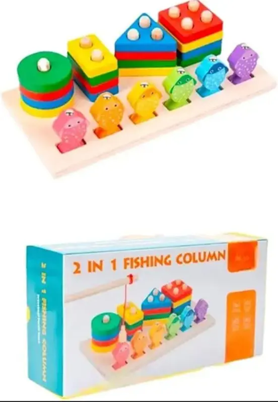 على جانب واحد، يمكنك الاستمتاع بلعبة صيد السمك المغناطيسية، حيث يستخدم الطفل سنارة خشبية لصيد الأسماك الملونة. هذه اللعبة ممتازة لتنمية المهارات الحركية الدقيقة والتنسيق بين اليد والعين. أما الجانب الآخر، فهو عبارة عن مسطرة للأشكال الهندسية مع 4 أعمدة مختلفة الارتفاع، حيث يتعلم الطفل مطابقة الأشكال والألوان ووضعها في مكانها الصحيح، مما يعزز التفكير المنطقي والوعي المكاني.