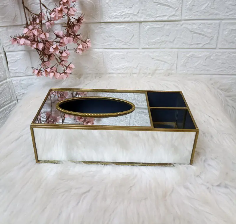 صُنعت هذه العلبة من المرآة العاكسة والمعدن الذهبي المصقول، مما يمنحها مظهرًا فاخرًا وجودة عالية. تتميز بحجمها الكبير لتناسب معظم علب المناديل، كما أنها مزودة بمنظم علوي مقسم لترتيب الأغراض الصغيرة.