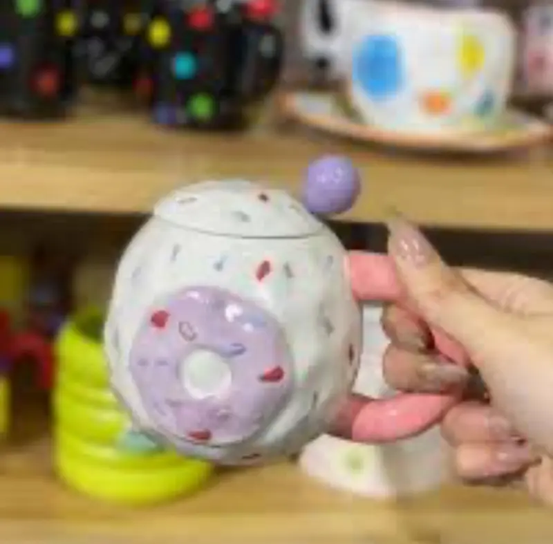 قطعة ديكور ساحرة ومرحة. نقدم لكِ هذا المج المصنوع من البورسلين عالي الجودة، بتصميم دونات ملونة وجذابة تضفي لمسة من البهجة على كل استخدام. المج مزود بملعقة خاصة وغطاء بتصميم فريد. بفضل متانته، يمكنكِ الاعتماد عليه للاستخدام اليومي، كما أنه سهل التنظيف. إنه ليس مجرد مج، بل هو قطعة فنية تعكس ذوقك المرح وتضيف لمسة جمالية إلى مطبخك أو على مكتبك. المج متوفر بتصميمات وألوان متنوعة لتناسب جميع الأذواق.