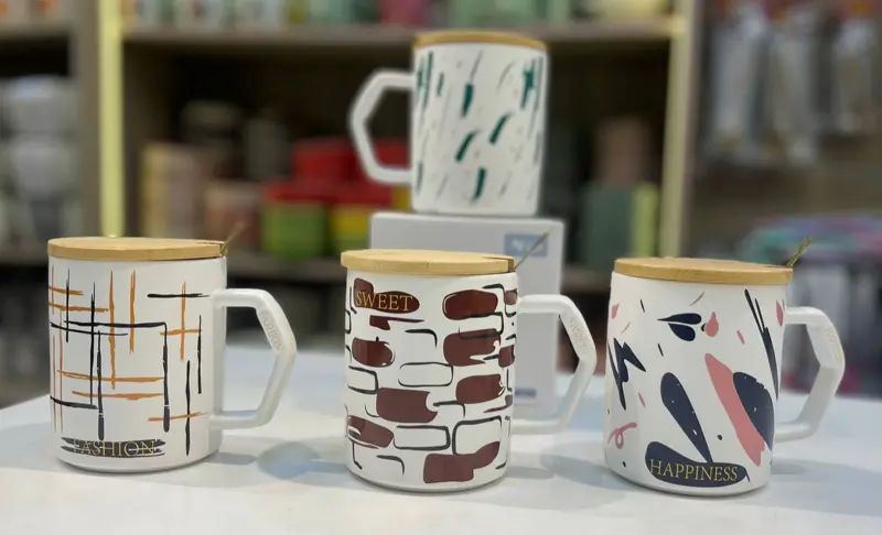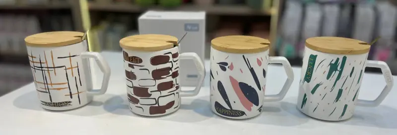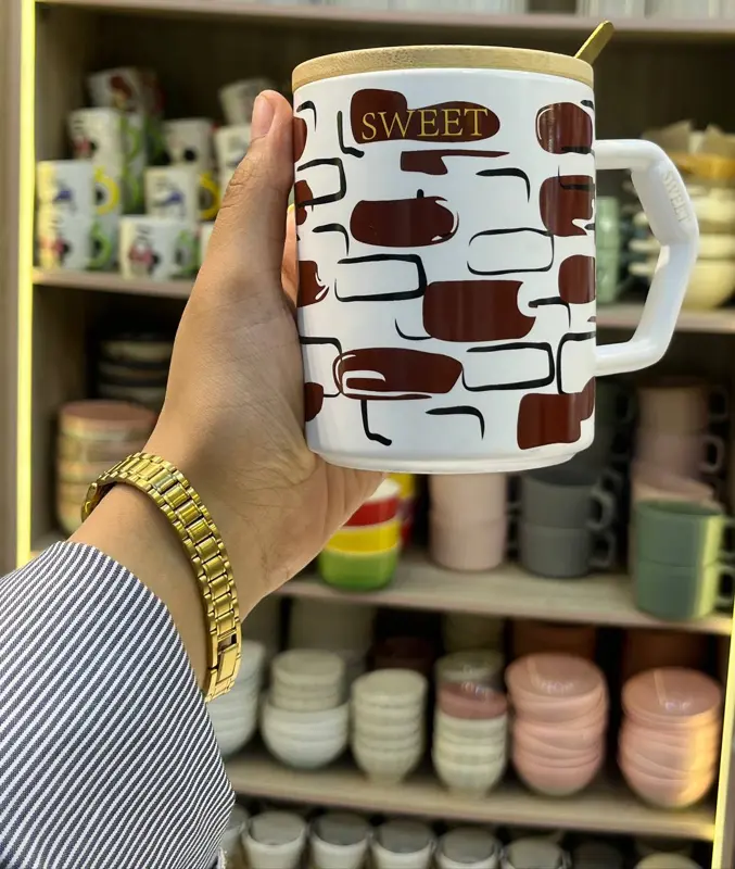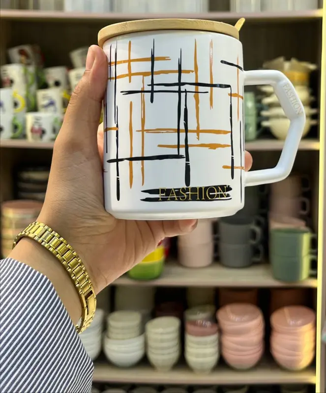 حوّلي فنجان قهوتكِ الصباحي إلى لوحة فنية! هذا المج البورسلين المستورد يجمع بين متانة البورسلين الفاخر والتصميم العصري، حيث يزدان بطبعات تشكيلية فريدة، ويأتي بغطاء خشبي أنيق.