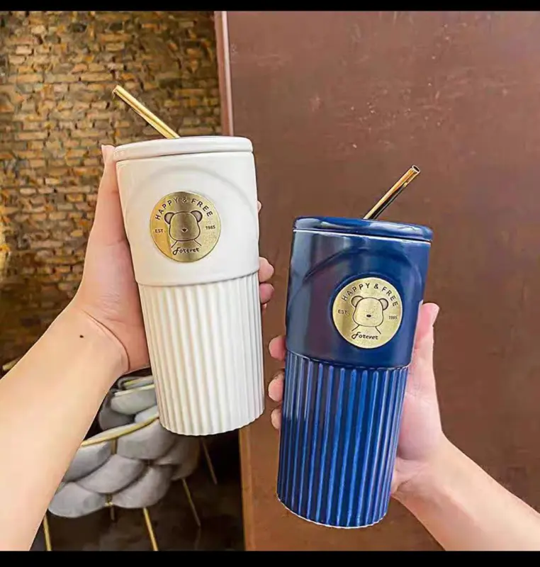 هذا المج هو قطعة مميزة للغاية، يجمع بين التصميم الجذاب والوظيفة العملية، مما يجعله إضافة رائعة لمجموعتك. مصمم بشكل اسطواني طويل، ويتميز بوجود شخصية دب لطيفة ومبهجة وكلمة "Happy & Free" على كل قطعة.