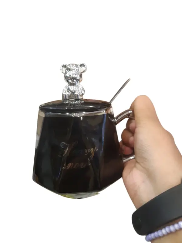 يأتي المج مع طبق مطابق، مما يجعله مثاليًا لتقديم المشروبات الساخنة مع وجبة خفيفة. كما يحتوي المقبض على شخصية دب كرتونية صغيرة، مما يضيف لمسة مرحة إلى التصميم. المج مصنوع من مادة عالية الجودة، وتصميمه الأنيق باللونين الأبيض والأسود يجعله مناسبًا للاستخدام اليومي أو كهدية أنيقة ومبتكرة.
