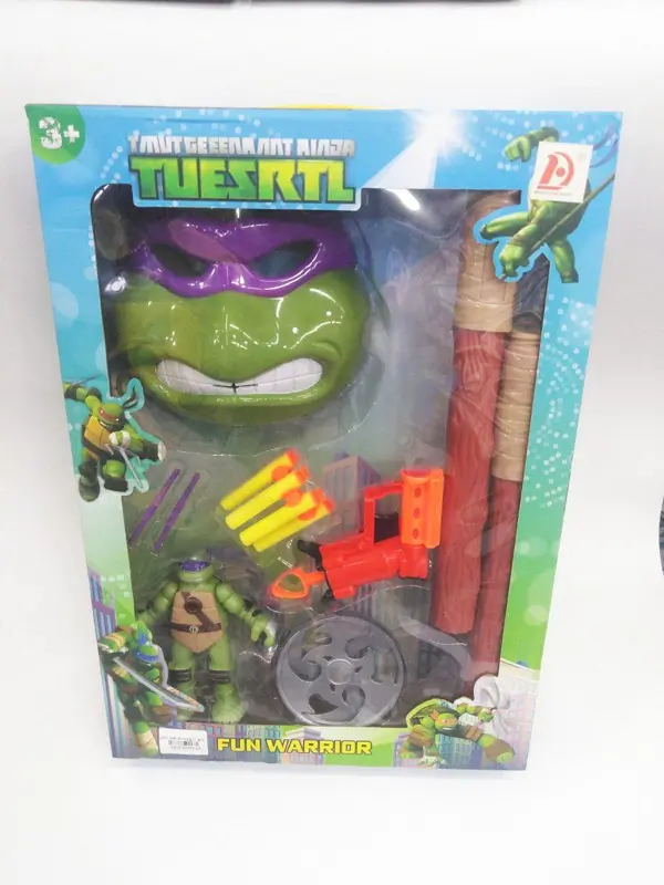 تتضمن العلبة أكثر من شخصية نينجا، كل واحدة بتصميم فريد وألوان مميزة، مع مفاصل قابلة للحركة لتمثيل الحركات القتالية. تأتي أيضاً مع تشكيلة واسعة من الأسلحة والإكسسوارات، مثل السيوف، الننشاكو، والنجوم. صُنعت الشخصيات من بلاستيك متين وآمن، مما يجعلها مثالية للعب العنيف والمنافسات.