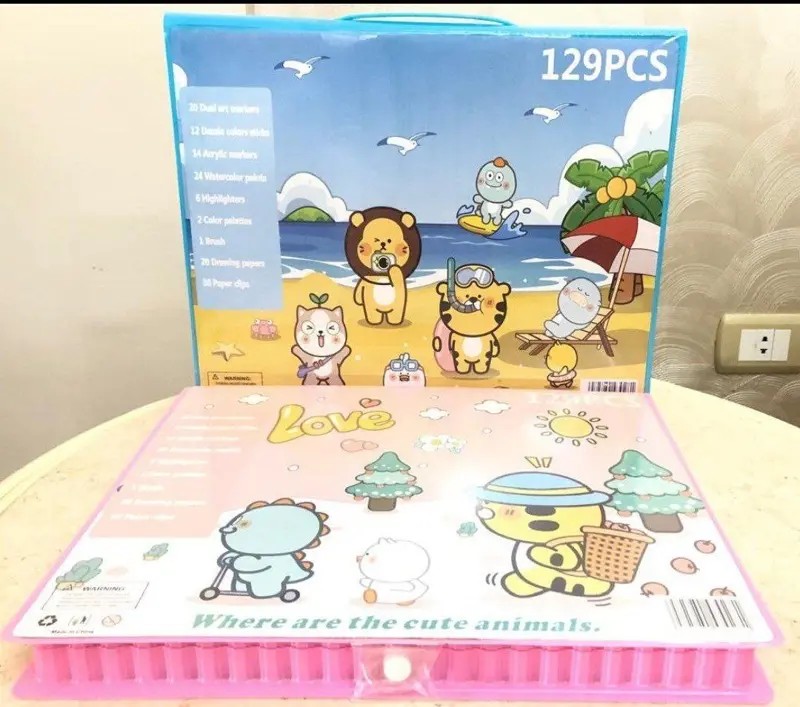 تأتي المجموعة في حقيبة أنيقة وسهلة الحمل مزينة برسوم حيوانات لطيفة. تحتوي على مجموعة متنوعة من الألوان والأدوات، مثل أقلام الألوان المزدوجة، وألوان الأكريليك، وألوان المياه، وورق الرسم، وفرشاة، ولوحات ألوان، والمزيد. جميع الأدوات مصنوعة من خامات آمنة وعالية الجودة.