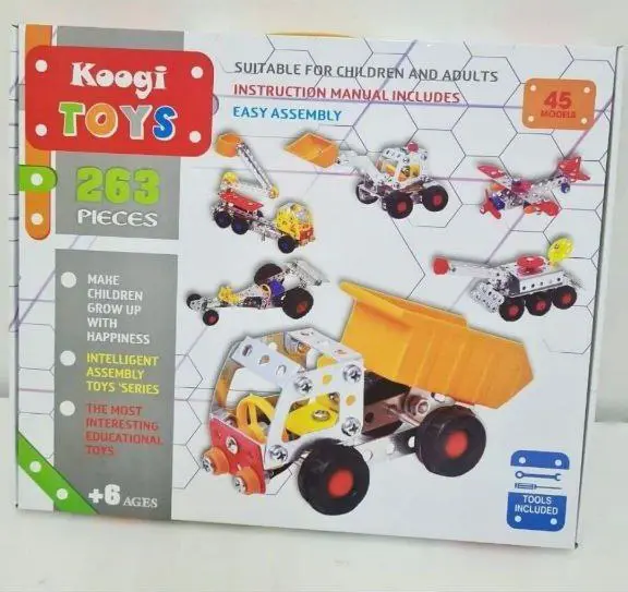 تتميز المجموعة بقطعها المصنوعة من المعدن المتين، مما يجعلها قوية وتدوم طويلاً. تتكون من 45 قطعة متنوعة تشمل ألواحاً مثقبة، ومسامير، وصواميل، وأدوات تركيب، مما يُمكن الطفل من بناء نماذج مختلفة. وهي مصممة لتكون آمنة وسهلة الاستخدام على أيدي الأطفال.