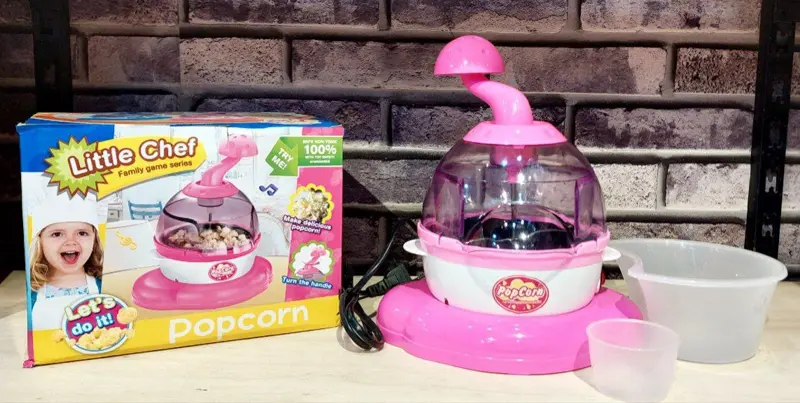 تتميز الماكينة بتصميمها الجذاب المستوحى من الطراز الكلاسيكي، وهي مصنوعة من بلاستيك آمن وخفيف الوزن. تأتي مع ملحقات صغيرة مثل أكواب الفشار، وتتميز بأزرار تُصدر أصواتاً وأضواءً عند التشغيل، مما يُحفز حواس الطفل ويزيد من تفاعله مع اللعبة.
