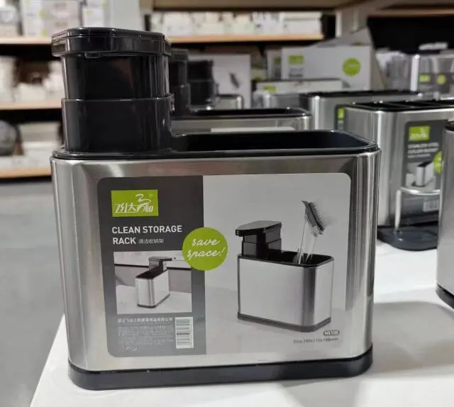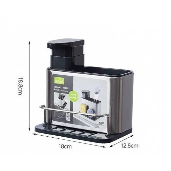 • 3 وظائف في قطعة واحدة: يجمع بين دسبنسر الصابون (المضخة)، حامل ليفة، و صفاية للملاعق/أدوات المطبخ في تصميم واحد موفر للمساحة.