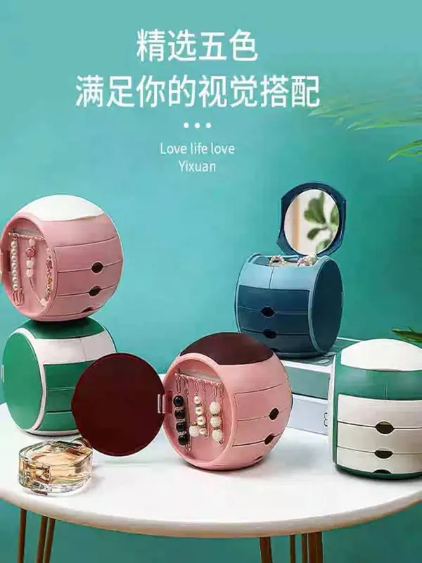 حافظي على إكسسواراتك المفضلة منظمة ومرتبة مع هذا المنظم الأنيق. يتميز المنظم بتصميمه الدوار الذي يحتوي على أدراج متعددة، مما يتيح لكِ تخزين مجموعة متنوعة من الإكسسوارات مثل الخواتم والأقراط والقلائد. المنظم مزود بمرآة، مما يجعله قطعة عملية ومناسبة للاستخدام على التسريحة أو المكتب.