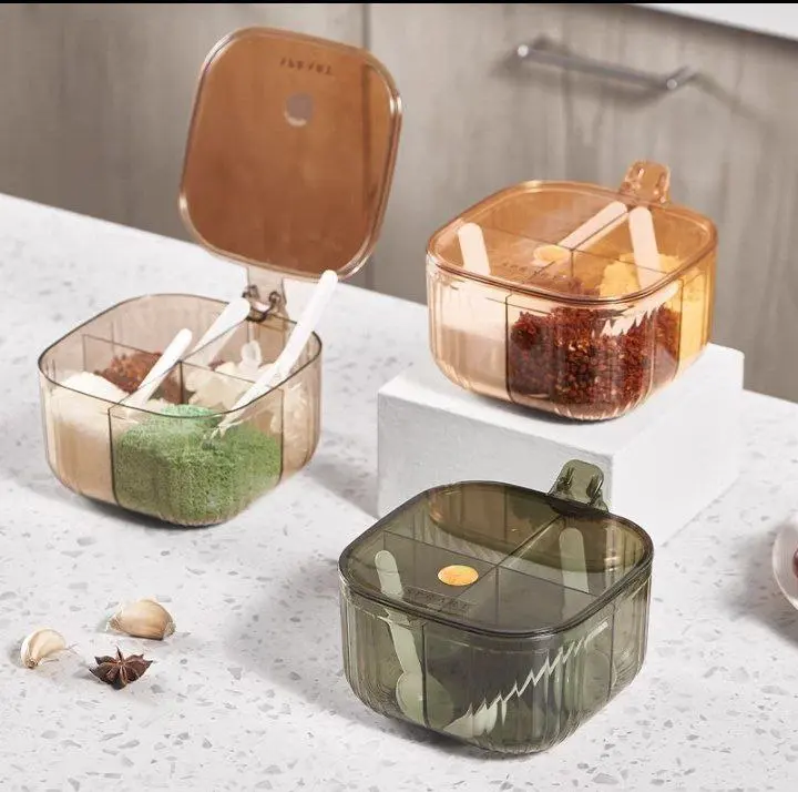 • 4 خانات منفصلة ومغلقة: تصميم مربع يحتوي على 4 أقسام لتخزين التوابل والبهارات المختلفة، وكل قسم له غطاء محكم.