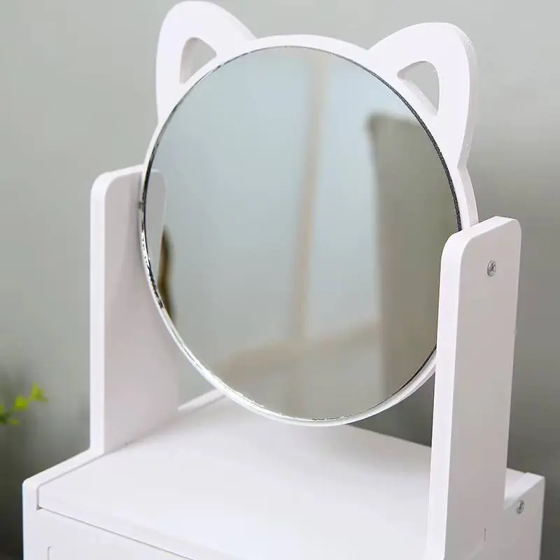 • تصميم جذاب ومميز: تتميز المرآة الدائرية بإطارها الرقيق على شكل أذني قطة، مع مقابض أدراج مزخرفة، مما يمنحها مظهراً فريداً يضيف لمسة جمالية مختلفة على غرفتك.
