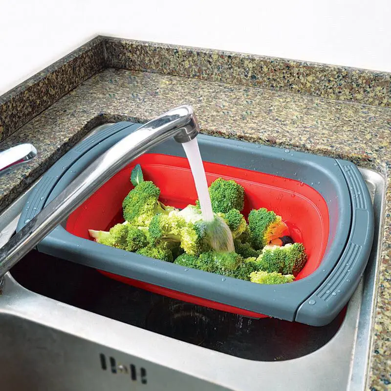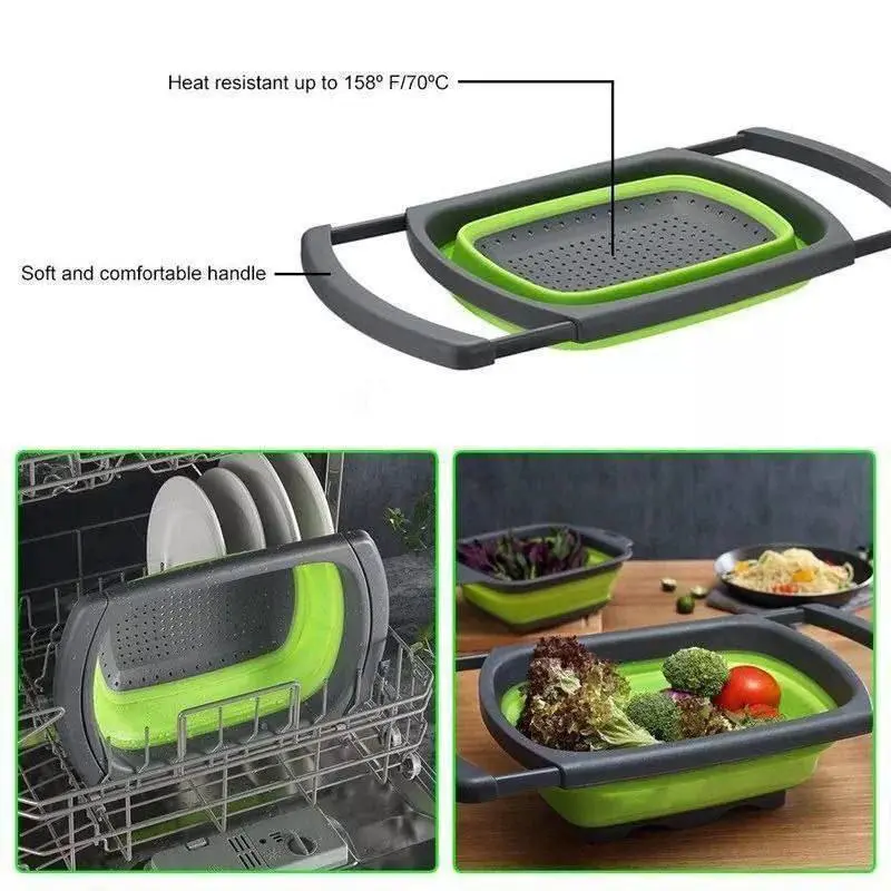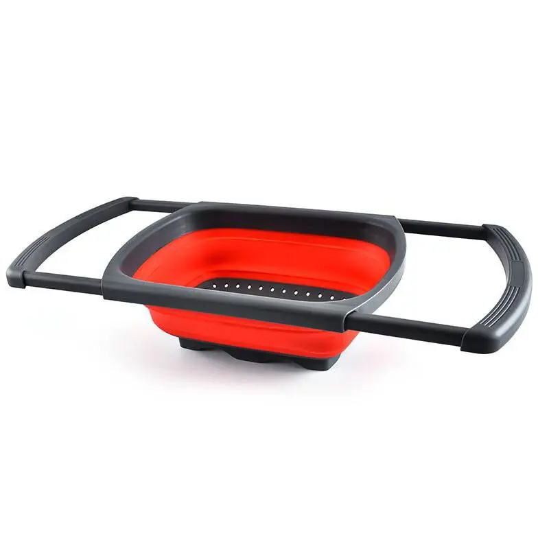 طريقة الاستخدام: افردي المصفاة وثبتيها على حافة الحوض عن طريق مد الأطراف حسب مقاس الحوض. استخدميها لتصفية المكونات أو الأطباق. عند الانتهاء، قومي بضغطها لطيّها وتخزينها في أي درج أو دولاب.