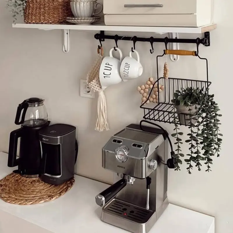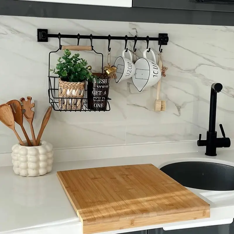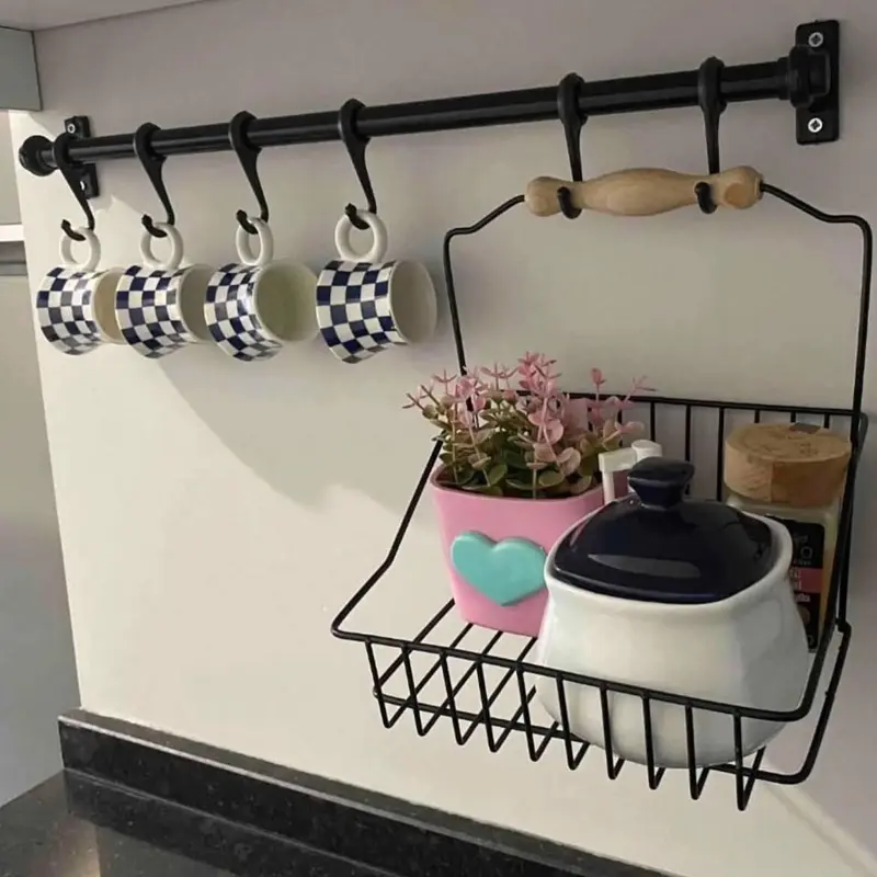 الحل المتكامل لترتيب مطبخكِ. هذه الماسورة المعدنية، بتصميمها الذي يجمع بين 4 وظائف أساسية، هي الإضافة المثالية لتوفير المساحة وتنظيم أدواتك. يبلغ طولها 60 سم وتأتي باللون الأسود، ومزودة بخمسة خطافات على شكل حرف S لتعليق الفوط أو أدوات الطهي. كما تتضمن حاملًا مخصصًا لتنظيم زجاجات الزيت والصلصات، بالإضافة إلى مطبقية معدنية للأطباق، مما يجعلها قطعة واحدة متعددة الاستخدامات.