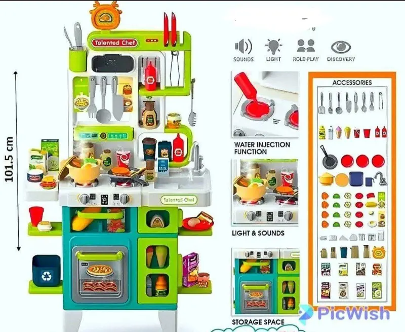 يتميز المطبخ بتصميم متين وألوان زاهية، ويبلغ طوله حوالي متر واحد. يحتوي على موقد إلكتروني يصدر أصواتاً وإضاءة واقعية، وحوض به صنبور يعمل بالماء. تأتي المجموعة مع 104 قطعة من الأكسسوارات المتنوعة، بما في ذلك أواني الطهي، والأكواب، والأدوات المختلفة، ومجسمات الطعام، مما يضمن تجربة لعب كاملة.