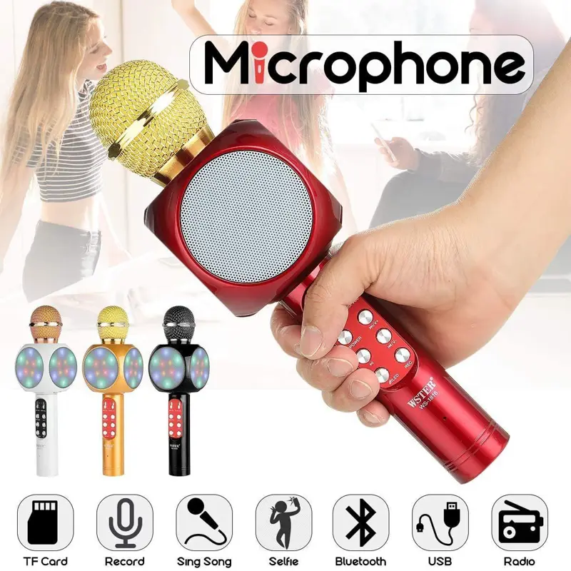 أضف جوًا من البهجة والمرح إلى حفلاتك وتجمعاتك العائلية مع ميكروفون كاريوكي بلوتوث WS-1816، جهاز الترفيه المتكامل المصمم ليطلق العنان لموهبتك في الغناء. يتميز هذا الميكروفون بصوت نقي وواضح بفضل مكبر الصوت المدمج، كما أنه مزود بإضاءة LED ملونة تُضيف لمسة احتفالية حقيقية. يعمل بسهولة عبر تقنية البلوتوث ويتصل بأي جهاز ذكي، ويدعم أيضًا مدخل AUX وبه مكان خاص لبطاقة الذاكرة (ميموري)، مما يمنحك خيارات تشغيل متعددة. بفضل بطاريته القوية القابلة للشحن، يمكنك استخدامه لساعات طويلة دون قلق. هذا الميكروفون ليس مخصصًا للغناء فقط، بل يمكن استخدامه كذلك لتشغيل الموسيقى، أو الاستماع إلى الراديو، أو حتى تسجيل صوتك. إنه منتج مثالي للأطفال والكبار على حد سواء، ومتوفر بألوان جذابة لتناسب جميع الأذواق.