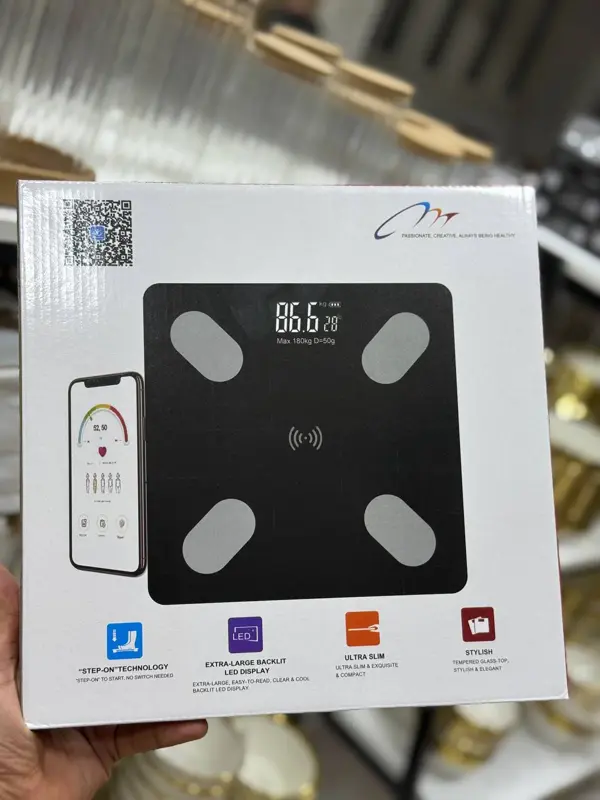 رفيقك للوصول إلى أهدافك الصحية بذكاء. هذا الميزان الإلكتروني يوفر لكِ أكثر من مجرد قياس الوزن، حيث يتصل بهاتفك المحمول عبر البلوتوث لتطبيق يدعم اللغة العربية ويقدم قراءات شاملة. يقيس الميزان نسبة الدهون، العضلات، العظام، والمياه في الجسم، بالإضافة إلى قياس درجة حرارة الجو. يتميز بسعة تحمل تصل إلى 180 كجم وشاشة LED ضوئية، وهو متوفر بحجم كبير وعبوة أصلية. إنه الأداة المثالية لمتابعة تقدمكِ نحو نمط حياة صحي.