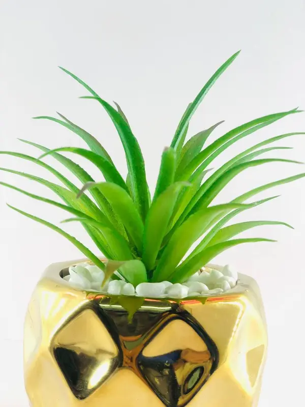 أضف لمسة من الفخامة والجمال إلى أي مساحة مع نبات الزينة في وعاء رخامي بتصميم ذهبي لامع. هذه القطعة الفنية الصغيرة هي الخيار الأمثل لإضفاء طابع فريد على مكتبك أو منزلك، كما أنها تُعد هدية فاخرة تحمل في طياتها قيمة جمالية عالية. صُمم هذا النبات ببراعة ليحاكي الطبيعي بأوراقه الخضراء النضرة التي لا تتغير، ويستقر في وعاء بلاستيكي متين يزدان بتصميم رخامي مذهل يغلب عليه اللون الذهبي البراق، مما يجعله قطعة مميزة في أي ديكور. بفضل متانته وخفة وزنه، يمكن نقله وتغيير مكانه بسهولة، كما أنه لا يتطلب أي رعاية على الإطلاق؛ فلا ماء ولا ضوء شمس، مما يوفر لك الأناقة والجمال دون أي مجهود. يبلغ ارتفاعه الإجمالي ٨ سم، وهو حجم مثالي لتزيين المكاتب، الأرفف، الطاولات الجانبية، أو أي ركن ترغب في إبرازه.