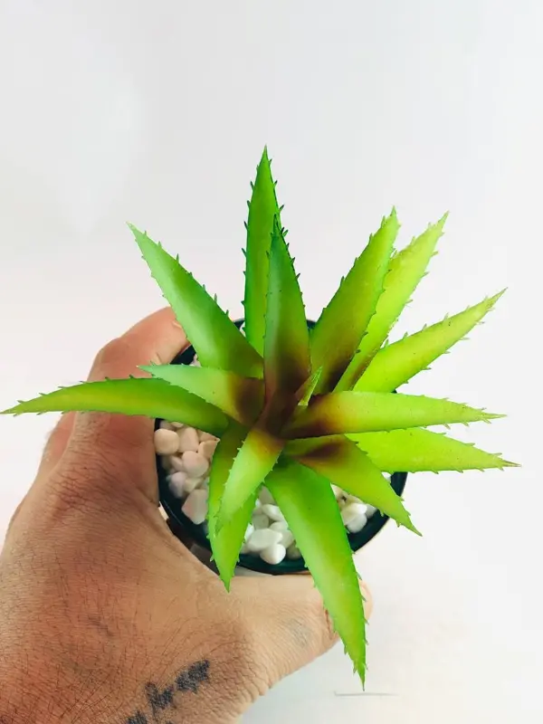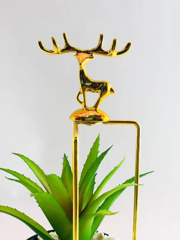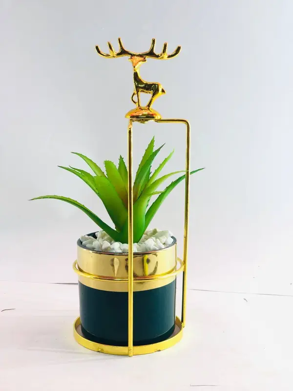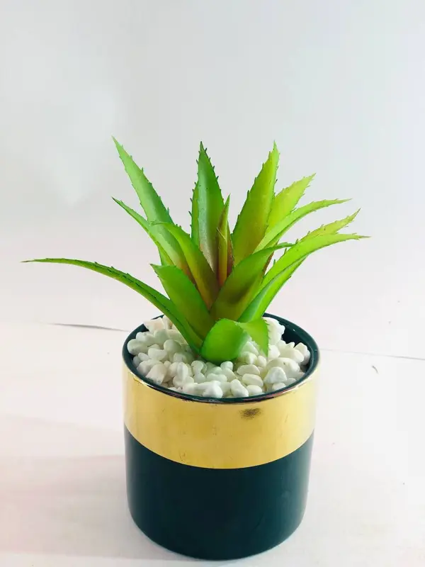 تتكون القطعة من نبات بلاستيكي واقعي مصنوع من أجود أنواع البلاستيك ليحتفظ بلونه الأخضر الزاهي. يوضع النبات داخل وعاء فاخر من الخزف، ويستقر كل ذلك على حامل معدني ذهبي مصقول يضيف للقطعة ثباتًا لا مثيل له. هذه الخامات عالية الجودة تضمن متانة وقوة المنتج، ليتحمل الاستخدام اليومي ويظل أنيقًا لسنوات طويلة دون أن يبهت لونه. لا يتطلب هذا النبات أي صيانة أو رعاية؛ فهو لا يحتاج إلى ماء أو ضوء شمس. يبلغ ارتفاعه الإجمالي ١٥ سم، مما يجعله مثاليًا للوضع على المكاتب، الرفوف، الطاولات الجانبية، أو أي ركن صغير في منزلك.