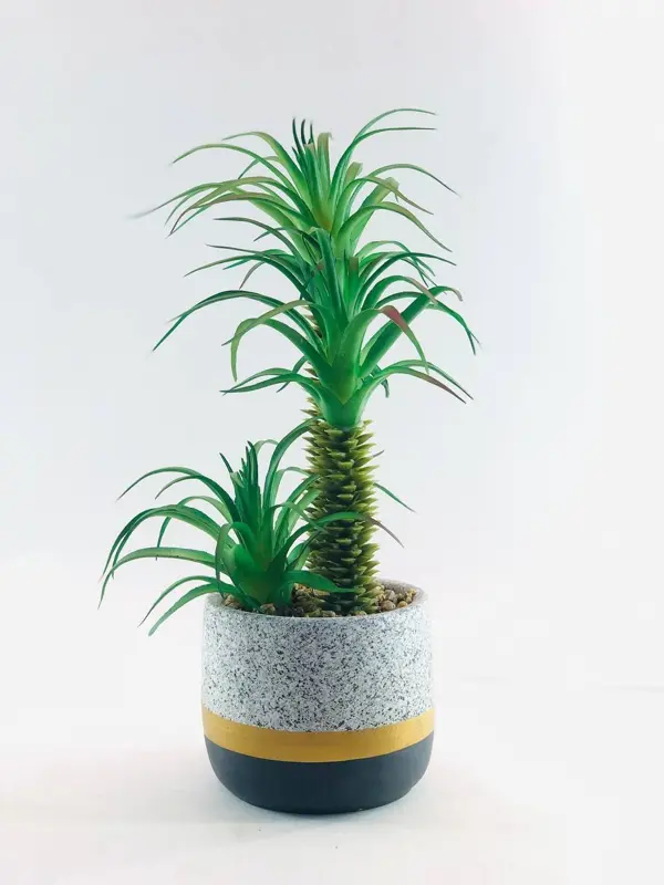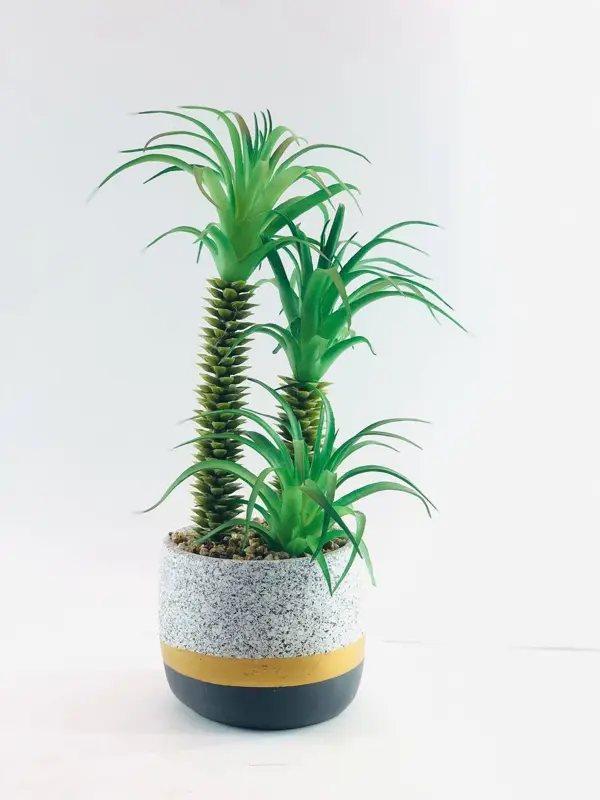 تخيل قطعة فنية صغيرة تحمل بين طياتها لمسة من الطبيعة وسحر التصميم العصري، هذه هي تحفة الديكور الخضراء في وعاء رخامي باللون الذهبي والأبيض والرمادي. صُممت لتكون أكثر من مجرد نبات، فهي بمثابة هدية مثالية تروي قصة الأناقة والفخامة في كل زاوية. هذا النبات، الذي يحاكي الطبيعي ببراعة متناهية، يزهو بأوراقه الخضراء الزاهية التي لا تعرف الذبول، ويستقر في وعاءه البلاستيكي المتين الذي يزدان بتصميم رخامي فريد من نوعه يجمع بين الألوان الذهبية والبيضاء والرمادية ليمنحه فخامة لا مثيل لها. بفضل متانة خاماته وقوته، يمكن الاعتماد عليه كقطعة ديكور تدوم طويلاً دون أن يتأثر جمالها. والأروع من ذلك، أنه لا يحتاج إلى أي رعاية على الإطلاق؛ فلا ماء ولا ضوء شمس، فقط ضعه في المكان الذي ترغب به. يبلغ ارتفاع الإناء مع الزرعة ٩ سم، مما يجعله إضافة مثالية لإضفاء الحيوية على مكتبك أو طاولتك الجانبية أو حتى رف الكتب المفضل لديك.