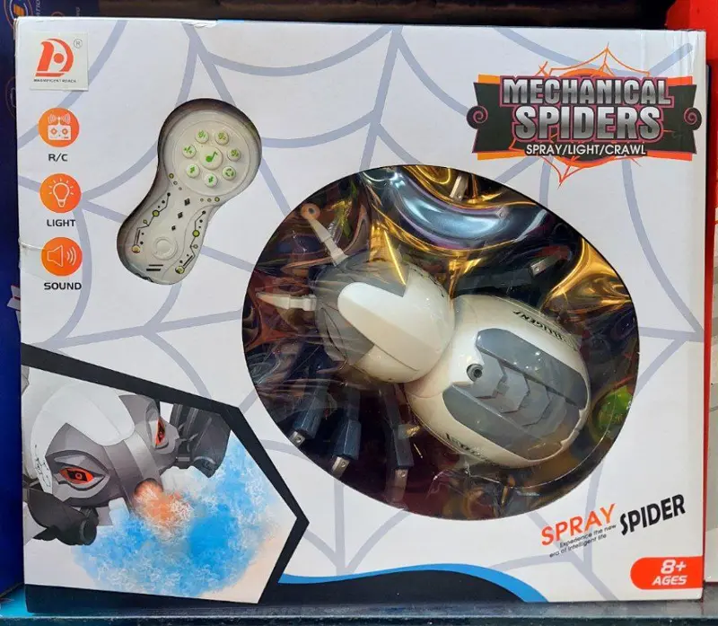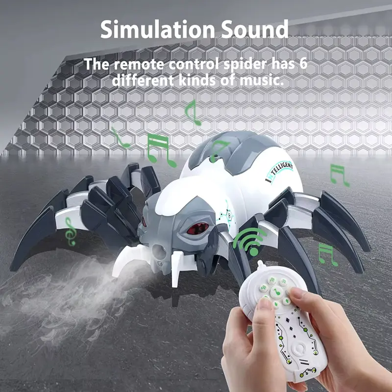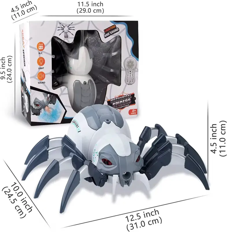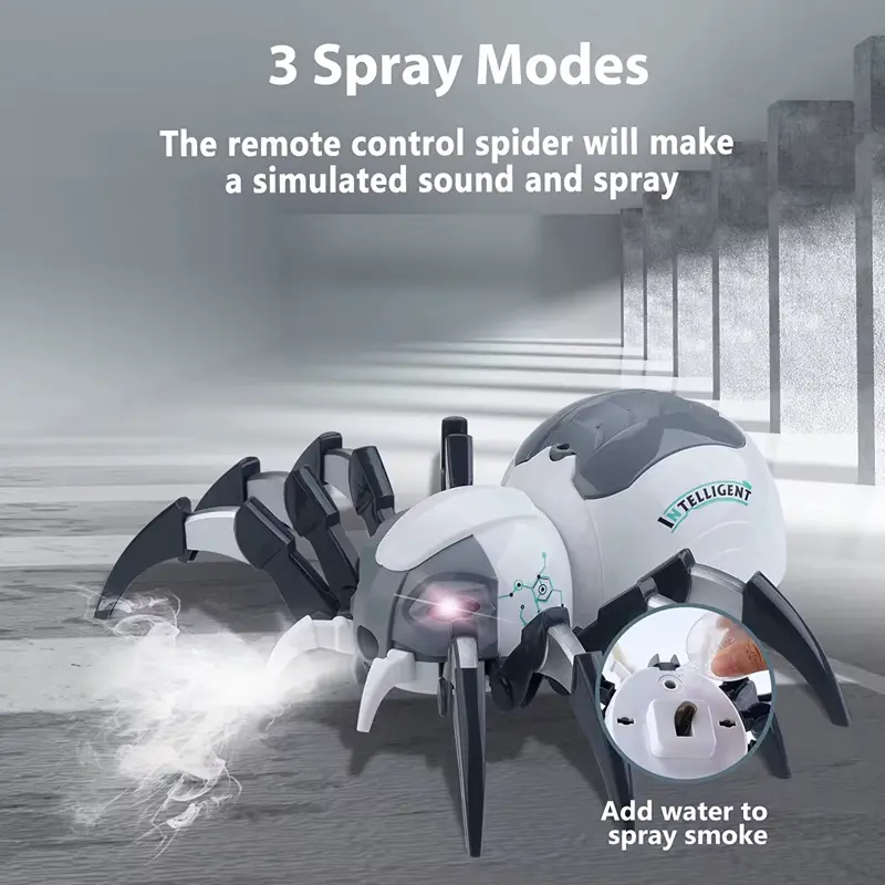 يتميز العنكبوت بتصميمه الذي يحاكي شكل العنكبوت الحقيقي، وله أرجل قابلة للحركة. يعمل بجهاز تحكم عن بعد يتيح التحكم الكامل في حركته، حيث يمكنه التحرك للأمام والخلف والدوران 360 درجة. يحتوي على خزان صغير للماء لإصدار مؤثر الدخان، مما يضيف واقعية إلى اللعبة. يأتي العنكبوت مع بطارية قابلة لإعادة الشحن.