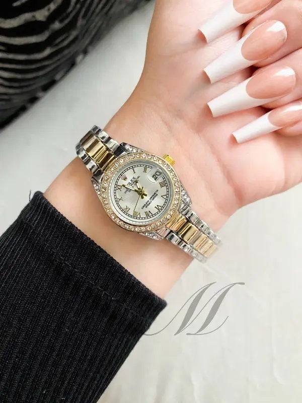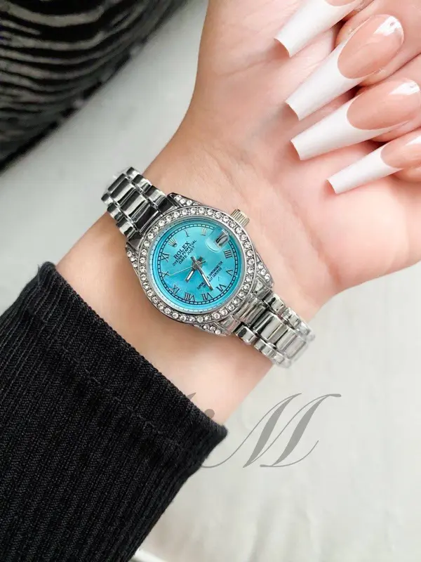 أضيفي لمسة من الجاذبية العصرية إلى مظهركِ مع ساعة ROLEX Mine الحريمي. تتميز هذه الساعة بتصميمها الأنثوي الأنيق، مع ميناء جذاب باللونين الفيروزي والأخضر، وإطار مرصّع بفصوص لامعة، وحزام معدني مريح باللونين الفضي والذهبي، وتأتي بجميع أختام الماركة التي تؤكد جودتها.