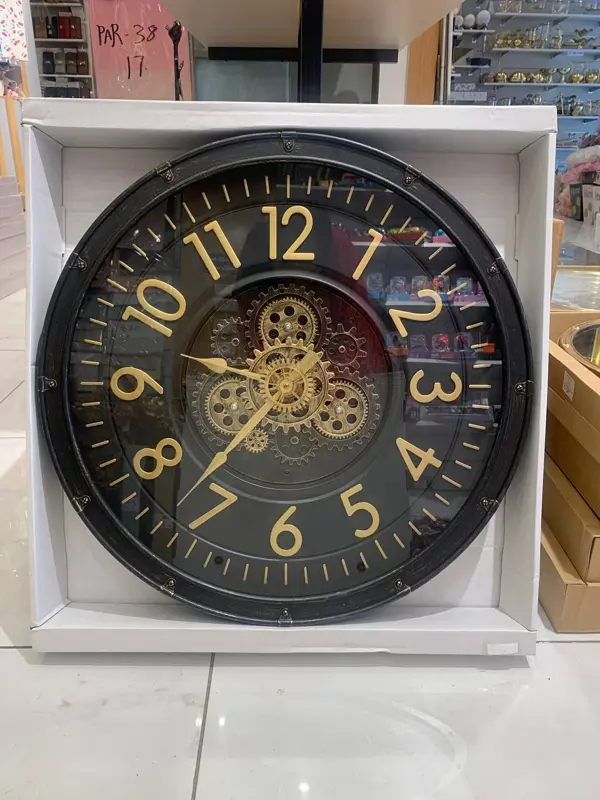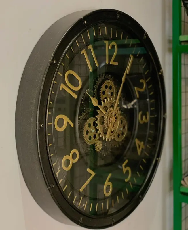 تتميز الساعة بحجمها الكبير المهيب بقطر 60 سم، مما يجعلها قطعة مركزية لا يمكن تجاهلها. إطارها الأسود الأنيق يحيط بقرص الساعة الجذاب، الذي يزدان بأرقام ذهبية بارزة وعقارب متناسقة تبرز بوضوح على الخلفية الداكنة. وفي قلب هذه التحفة، تكمن مجموعة من التروس الميكانيكية المتحركة، التي تدور بانسجام لتقدم مشهدًا بصريًا ساحرًا يجسد براعة التصنيع والدقة المتناهية، ويضفي لمسة حيوية وفنية لا مثيل لها.