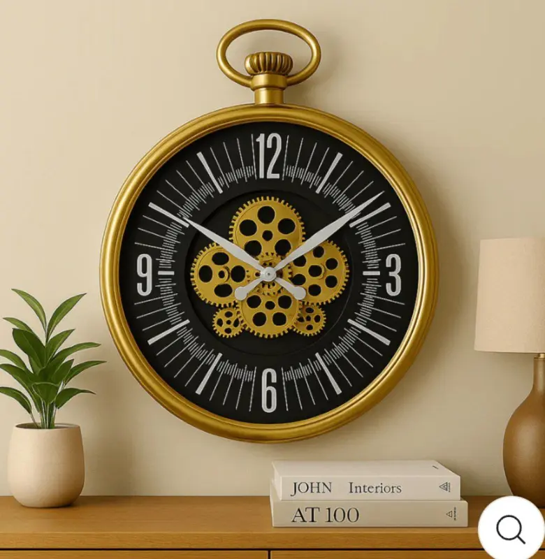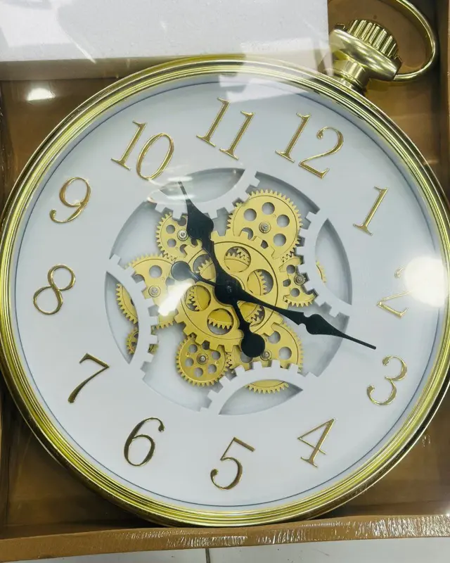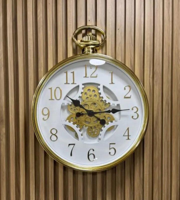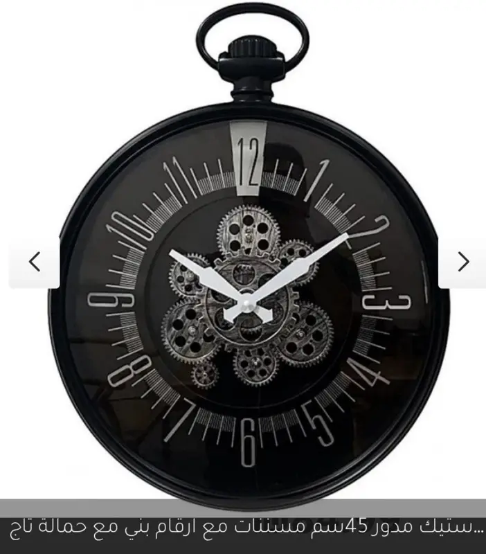 تتميز الساعة بقطر 45 سم، مما يجعلها إضافة مثالية لغرفة المعيشة أو المكتب. يبرز جمالها في التباين الأنيق بين الإطار الأسود الأنيق والقرص الأبيض النقي، مما يخلق لوحة بصرية مذهلة. في قلب الساعة، تدور مجموعة من التروس الميكانيكية باللون الفضي، لتشكل تصميمًا فنيًا آسرًا يعكس دقة الصناعة ويضيف بعدًا حيويًا على الجدار.
