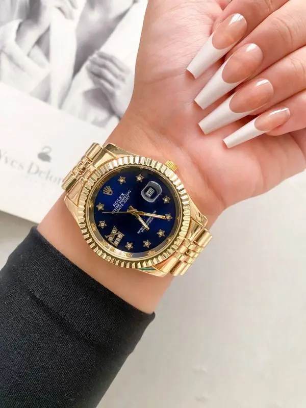 اجذب الأنظار مع ساعة رولكس إصدار بلو سي ماستر رجالي. تتميز هذه الساعة بتصميمها الأنيق والألوان الجذابة، مع قرص باللون الأزرق الجريء وهيكل وأوستك معدني باللون الذهبي والفضي.