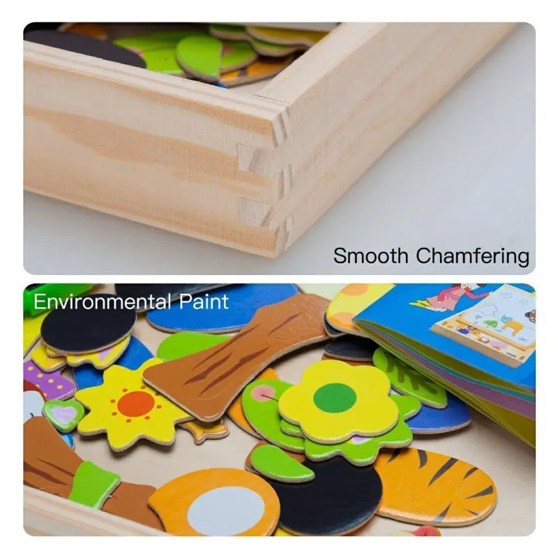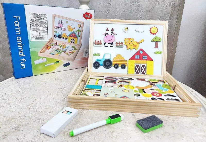 تتميز السبورة بتصميمها الآمن مع إطار على شكل وجه قطة أو حيوان آخر. تعمل بتقنية مغناطيسية تسمح بالرسم والكتابة بسهولة، ويُمكن مسحها بضغطة زر. تأتي مع قلم خاص وعدد من الأختام المغناطيسية على شكل حيوانات، مما يضيف المرح على الرسومات. جميع المواد المستخدمة آمنة تماماً على الأطفال.