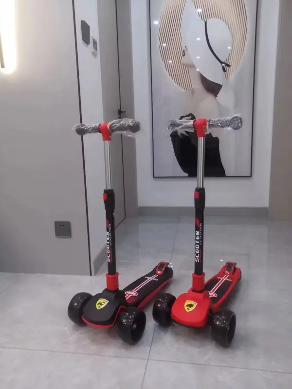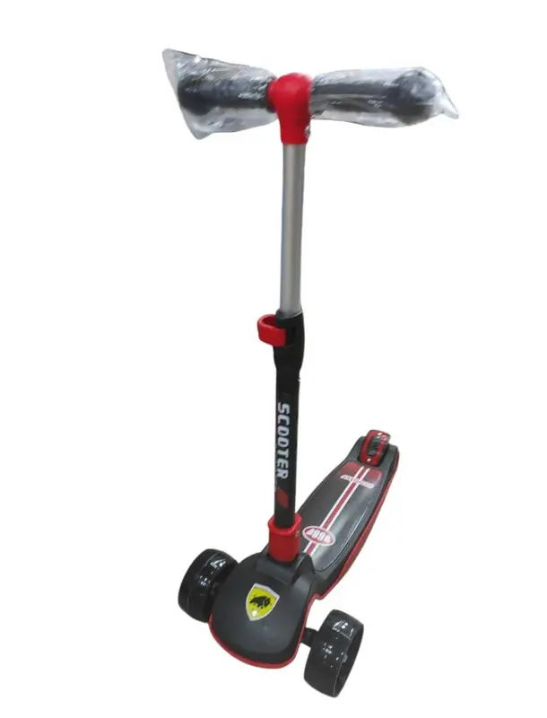 يتميز السكوتر بتصميمه الملون بالأحمر والأصفر، مع شعار فيراري الشهير الذي يضفي عليه طابعاً فريداً. مزود بعجلة أمامية مضيئة تضيء أثناء الحركة، مما يضيف لمسة من المرح والأمان. مصنوع من خامات عالية الجودة ومتينة، وهو قابل للطي لسهولة التخزين والنقل. كما أن المقبض قابل للتعديل ليناسب طول الطفل.
