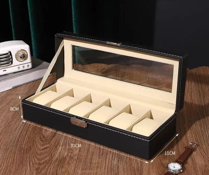 احمِ ساعاتك ومجوهراتك المفضلة من الخدوش والغبار مع هذا الصندوق المنظم الأنيق. صُمم الصندوق من جلد عالي الجودة، مما يمنحه مظهرًا فاخرًا ويضمن متانته. يحتوي الصندوق على أقسام مخصصة لترتيب الساعات، مما يحافظ على كل قطعة في مكانها ويمنع تشابكها. بالإضافة إلى استخدامه لتخزين الساعات، يمكن استغلال بعض الأقسام لتنظيم المجوهرات الأخرى مثل الأساور أو الخواتم. يتميز الصندوق بغطاء شفاف يسمح لكِ برؤية محتوياته دون الحاجة إلى فتحه، مما يسهل عليكِ اختيار ما ترتدينه.