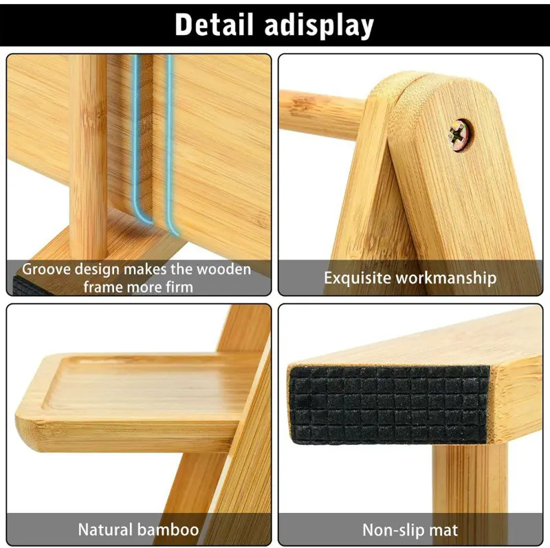 صُنع هذا الاستاند من خشب عالي الجودة بتصميم من طبقتين، مما يجعله قويًا ومتينًا. يمنحكِ تصميمه العملي مساحة إضافية على الأسطح، ويسمح لكِ بتنظيم أغراضكِ بشكل عمودي للحصول على مظهر مرتب وجذاب.