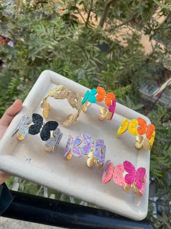 أضيئي معصمك بلمسة من الحيوية والجمال المستوحى من الشاطئ مع هذه الإسورة الجذابة. تتميز بتصميم فريد يجمع بين الخيوط المنسوجة الملونة والمعدن الذهبي اللامع، مما يجعلها قطعة مثالية لإضفاء لمسة من البهجة على إطلالتك.