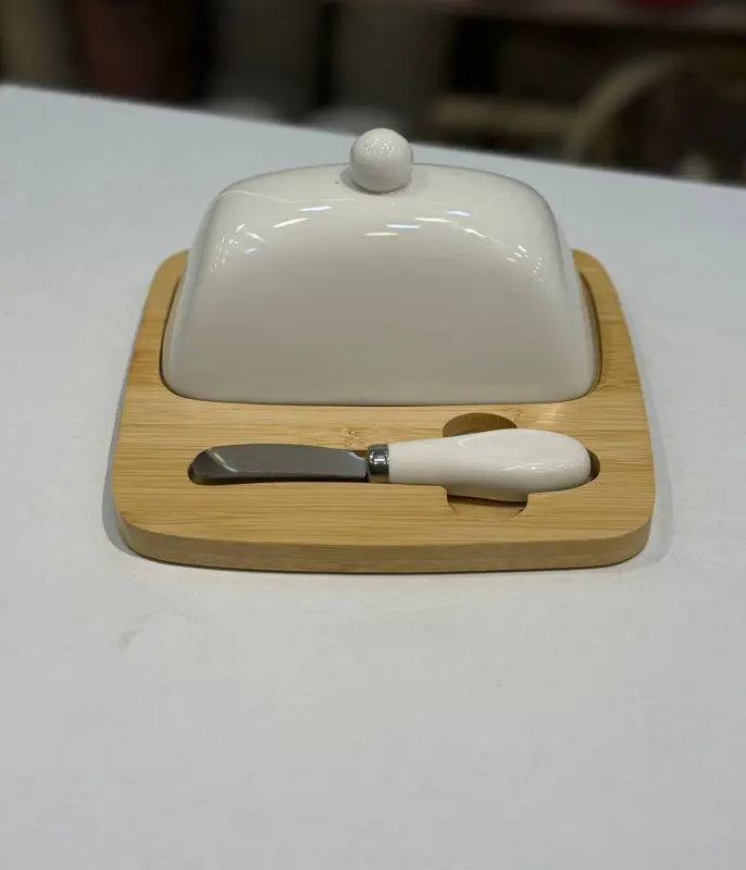 نقدم لك طبق الزبدة الأنيق، الذي يجمع بين الجمال والوظيفة. يتميز الطبق بتصميمه الذي يجمع بين البورسلين والخشب، مما يمنحه مظهرًا عصريًا وأنيقًا. يأتي الطبق مع سكين لتقطيع الجبنة، مما يجعله طقمًا متكاملًا لتقديم الأطعمة.