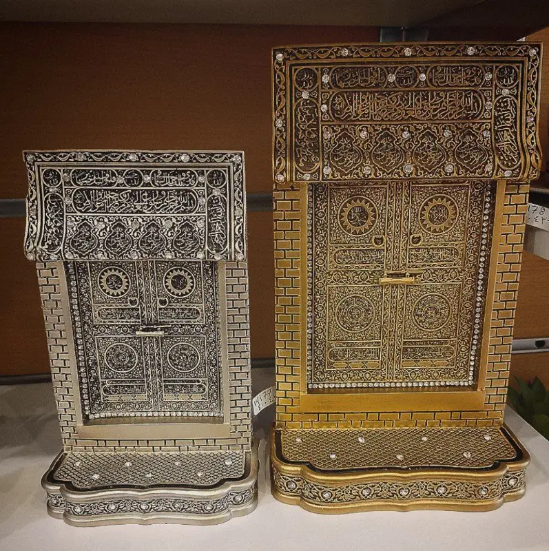 صُنعت هذه التحفة من خامة صلبة عالية الجودة، مما يمنحها ثباتًا ومتانة. يتميز تصميمها بالنقوش الذهبية الدقيقة والزخارف الإسلامية المتداخلة التي تعكس فخامة وجمال الأبواب المقدسة. قطعة آمنة وثابتة، مثالية للعرض الدائم.