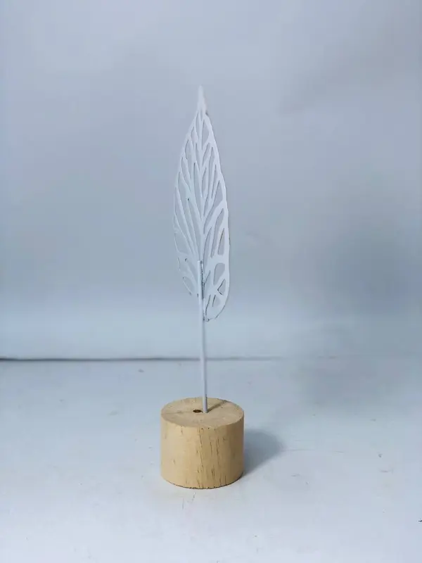 تتميز التحفة بأوراق معدنية بيضاء مصممة بدقة، تستقر على قاعدة خشبية طبيعية تضفي عليها دفئًا وجمالًا. التناغم بين المعدن الأنيق والخشب الدافئ يجعلها قطعة فنية عصرية.