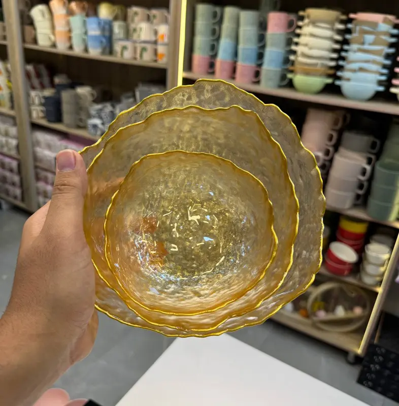 نقدم لكِ طقم البولات الزجاجي، وهو إضافة مميزة لمائدة الطعام أو المطبخ. يتميز الطقم بتصميمه الأنيق وحرفه الذهبي، مما يمنحه مظهرًا فاخرًا. الطقم مكون من 3 قطع بمقاسات مختلفة، مما يجعله مثاليًا لتقديم الخشاف أو غيره من الأطعمة.