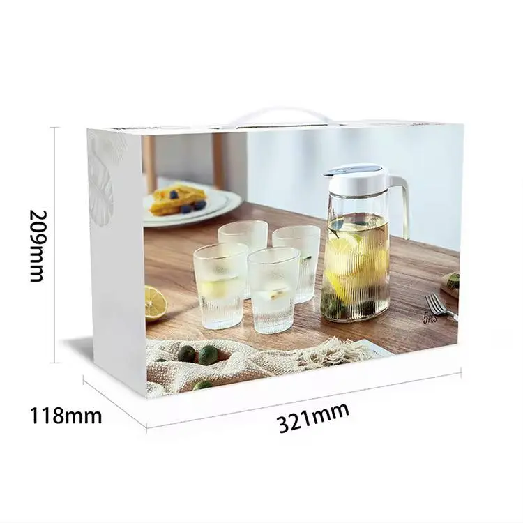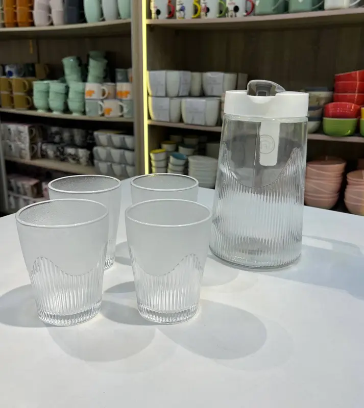 • طقم متكامل: تحتوي المجموعة على دورق زجاجي أنيق وأربعة أكواب متناسقة، لتكون جاهزة لتقديم المشروبات لجميع أفراد عائلتك أو ضيوفك.