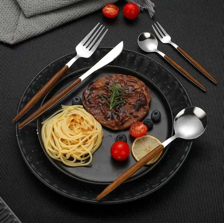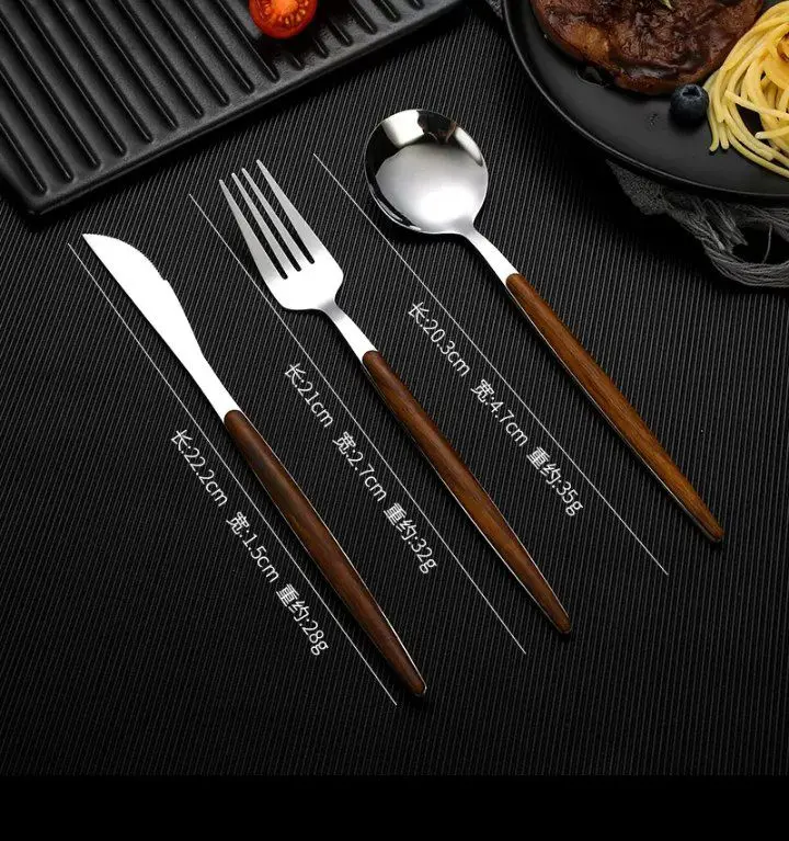 • طقم متكامل 24 قطعة: يضم 6 سكاكين، 6 شوك، 6 ملاعق كبيرة، و 6 ملاعق صغيرة (خدمة لـ 6 أشخاص).