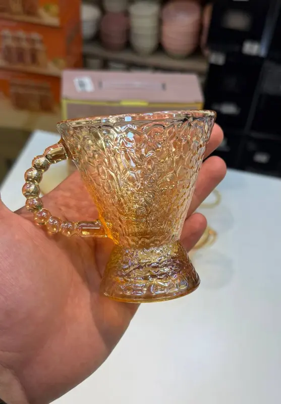 طقم فناجين يجمع بين الأصالة والعصرية! هذا الطقم الزجاجي المستورد بلونه العسلي الدافئ يتميز بجمالية النقوش المنقرشة وتفاصيل المقبض البابلز الفريدة، ليضيف لمسة راقية جداً لجلسات قهوتك أو شاي الأصيل.