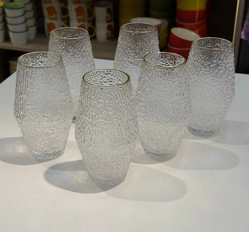 • نقوش فخمة ومبهرة: تتميز الأكواب بتصميم منقوش ومضلع على كامل السطح، مما يعكس الضوء بشكل مذهل ويضيف فخامة إلى أي مشروب.