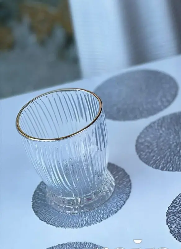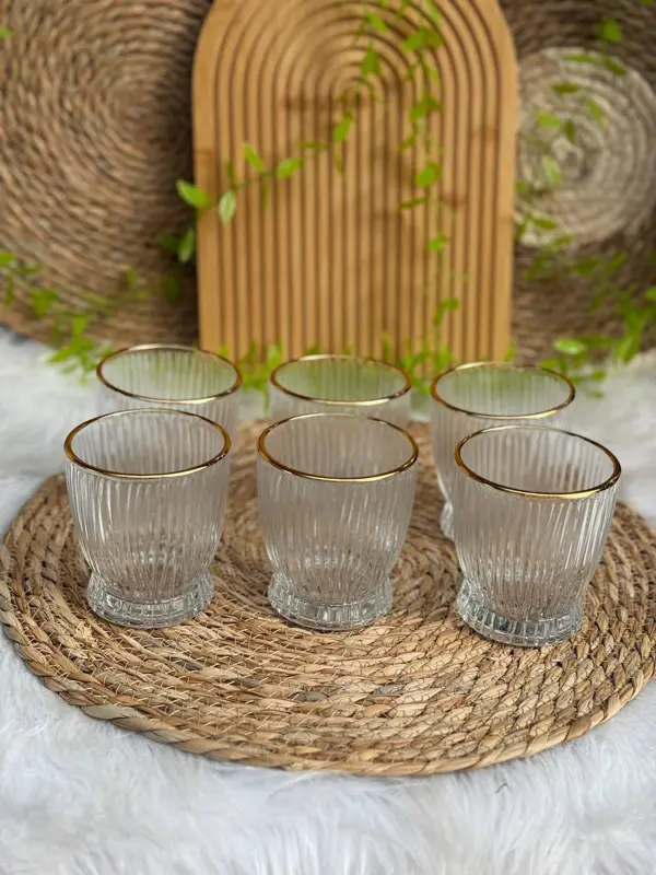لمسة فاخرة تضيء مناسباتك. هذا الطقم الأنيق المكون من 6 أكواب هو الإضافة المثالية لمائدتك، فهو يجمع بين الجمال الكلاسيكي والعصري. يتميز بتصميمه المضلع وحوافه الذهبية التي تضفي عليه فخامة لا مثيل لها. مصنوع من زجاج نقي مستورد، كل كوب بسعة 300 مل، وهو مثالي لتقديم العصائر والمشروبات الباردة. اجعلِ كل لحظة مميزة مع هذه الأكواب التي تعكس الذوق الرفيع.
