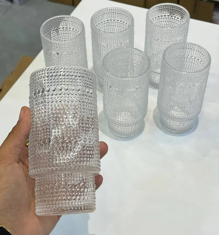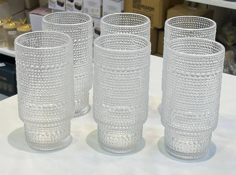 أبهري ضيوفكِ بجمالية التقديم مع هذا الطقم الزجاجي المستورد الجديد! يتميز طقم الشوب الزجاجي بتصميمه المنقرش الفاخر، الذي يضيف انعكاسات ضوئية ساحرة على مشروباتك، ليجعل كل رشفة تجربة ممتعة وراقية.